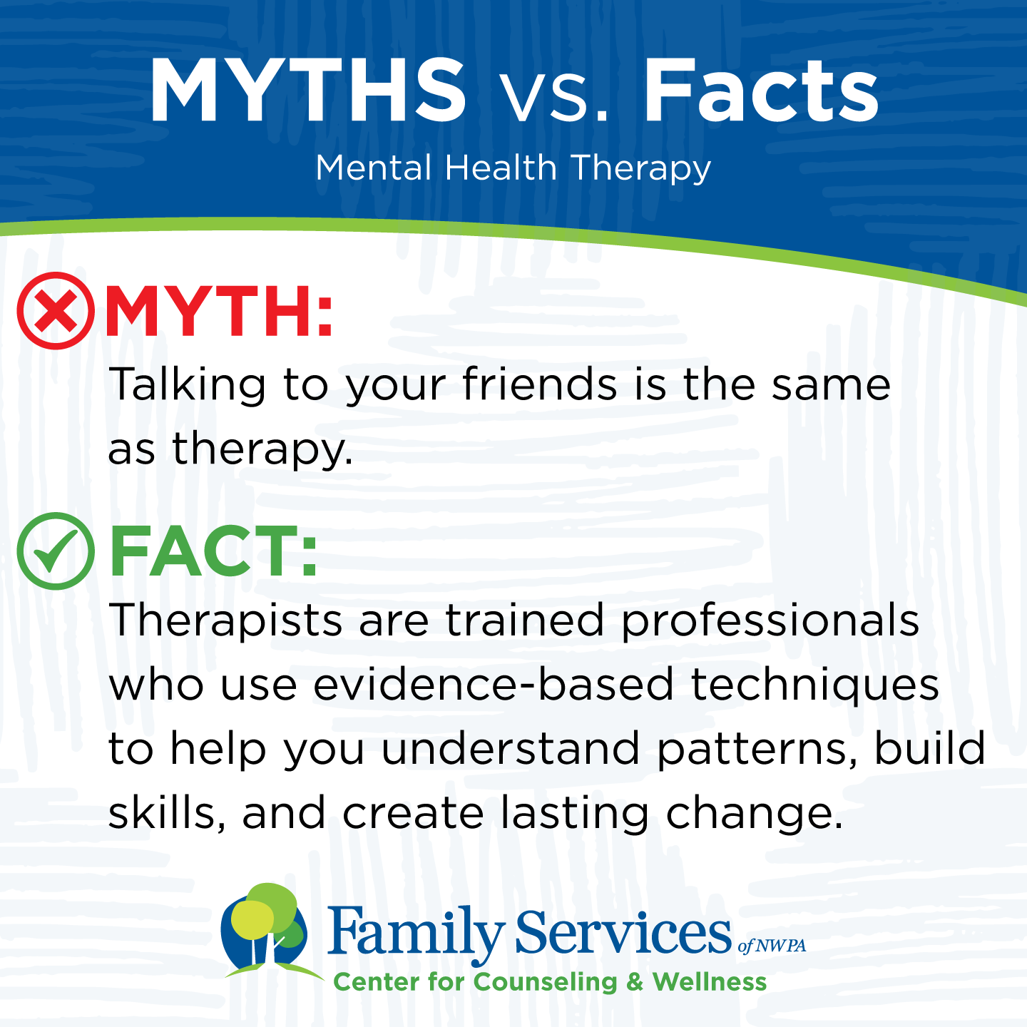FACT: Therapists are trained professionals who use evidence-based techniques to help you understand patterns, build skills, and create lasting change.
