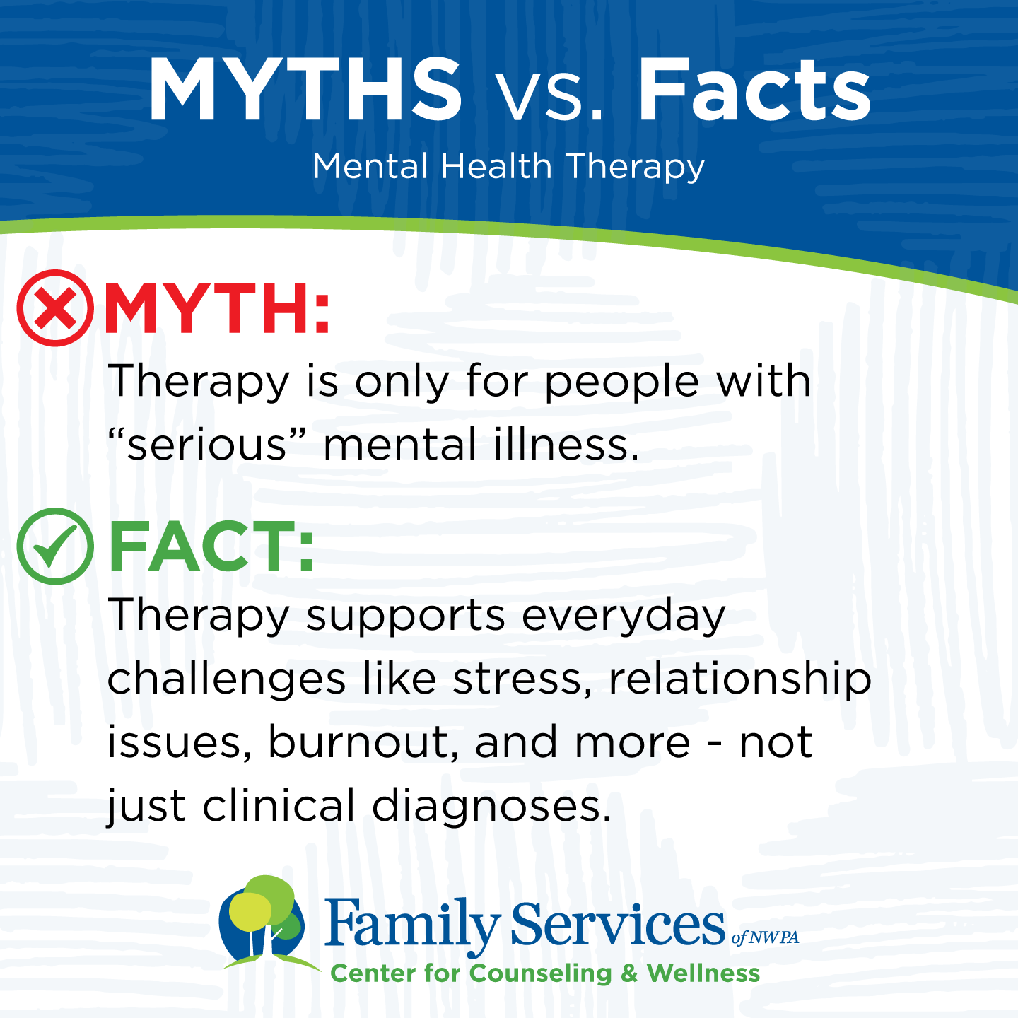 FACT: Therapy supports everyday challenges like stress, relationship issues, burnout, and more – not just clinical diagnoses.