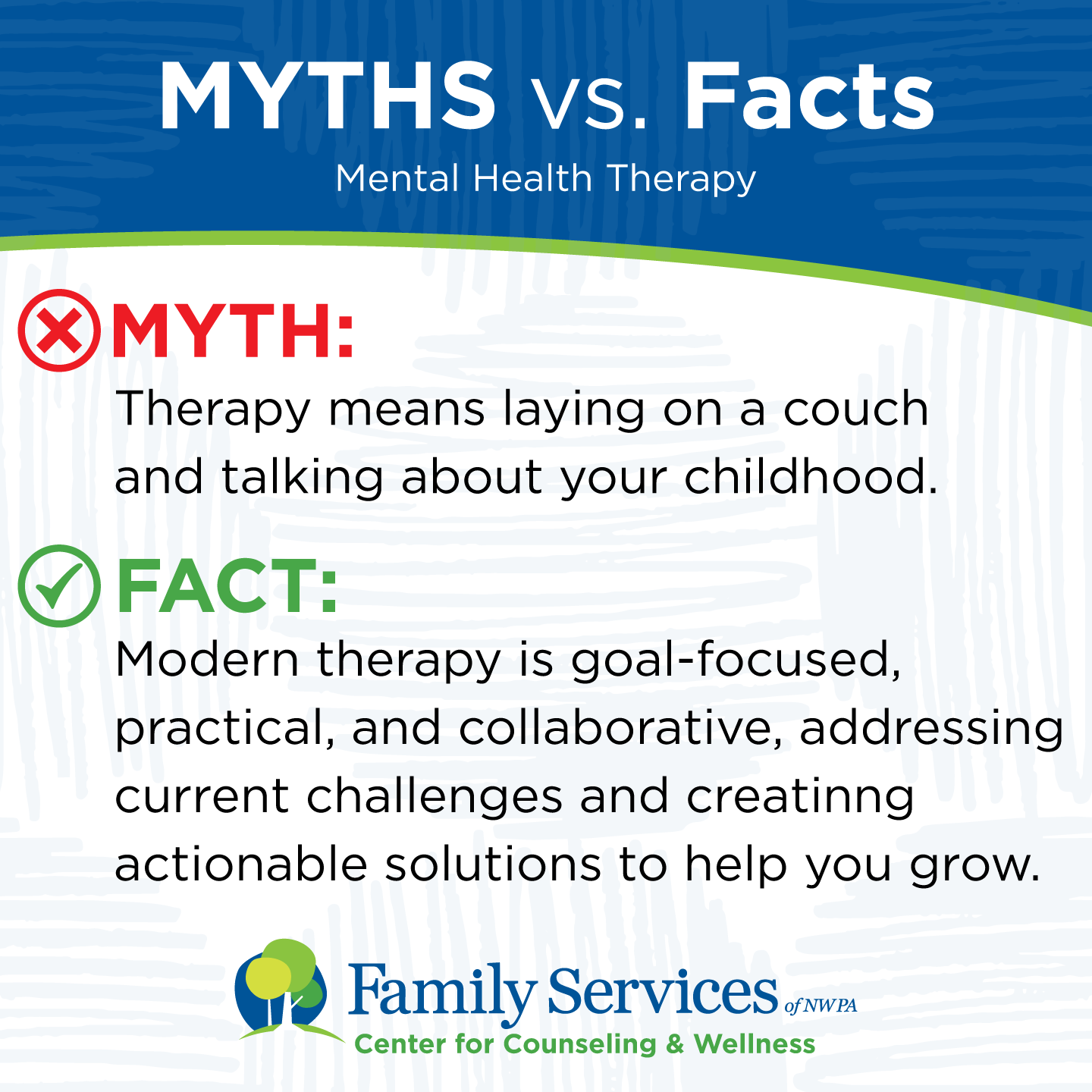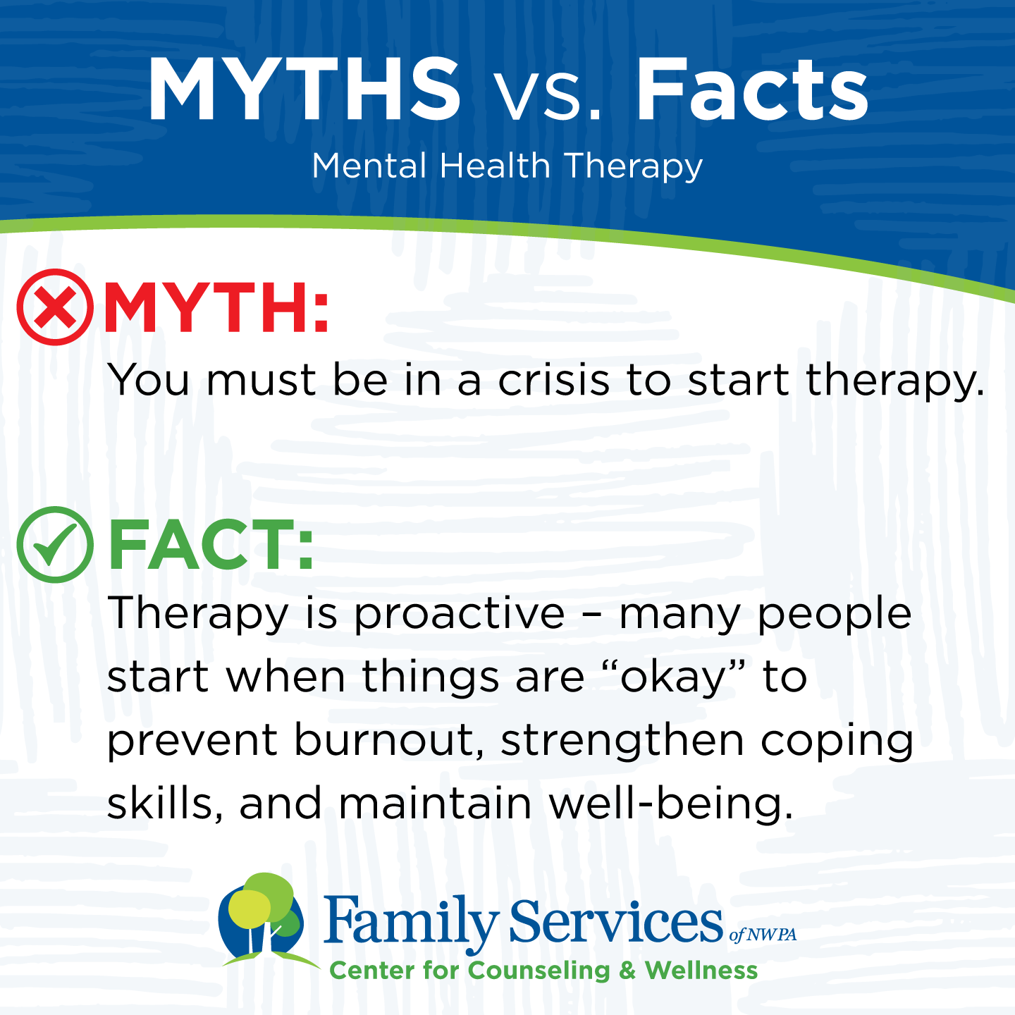 TRUTH: Therapy is proactive – many people start when things are "okay" to prevent burnout, strengthen coping skills, and maintain well-being.